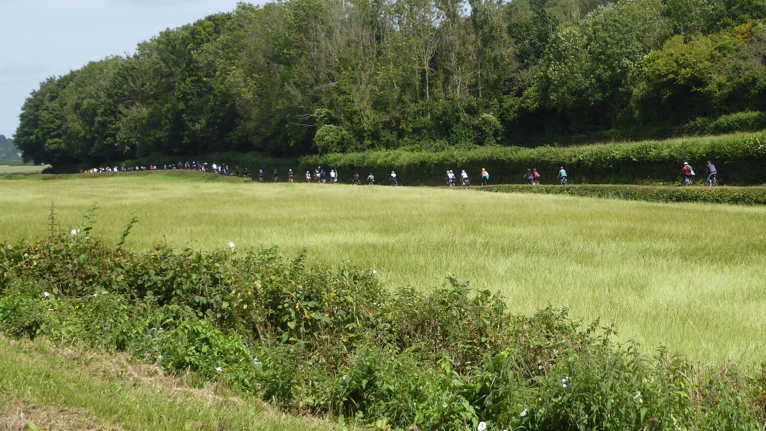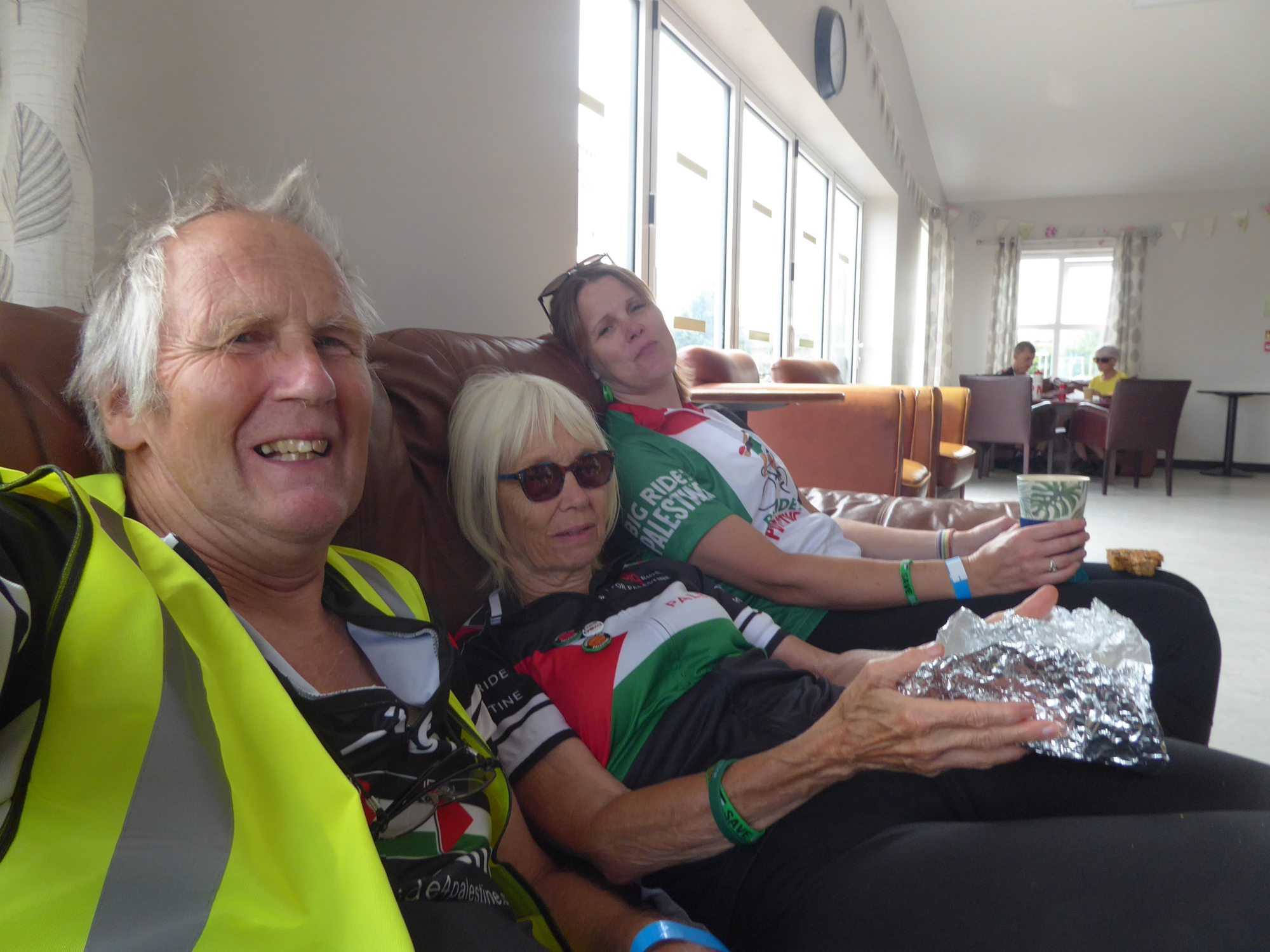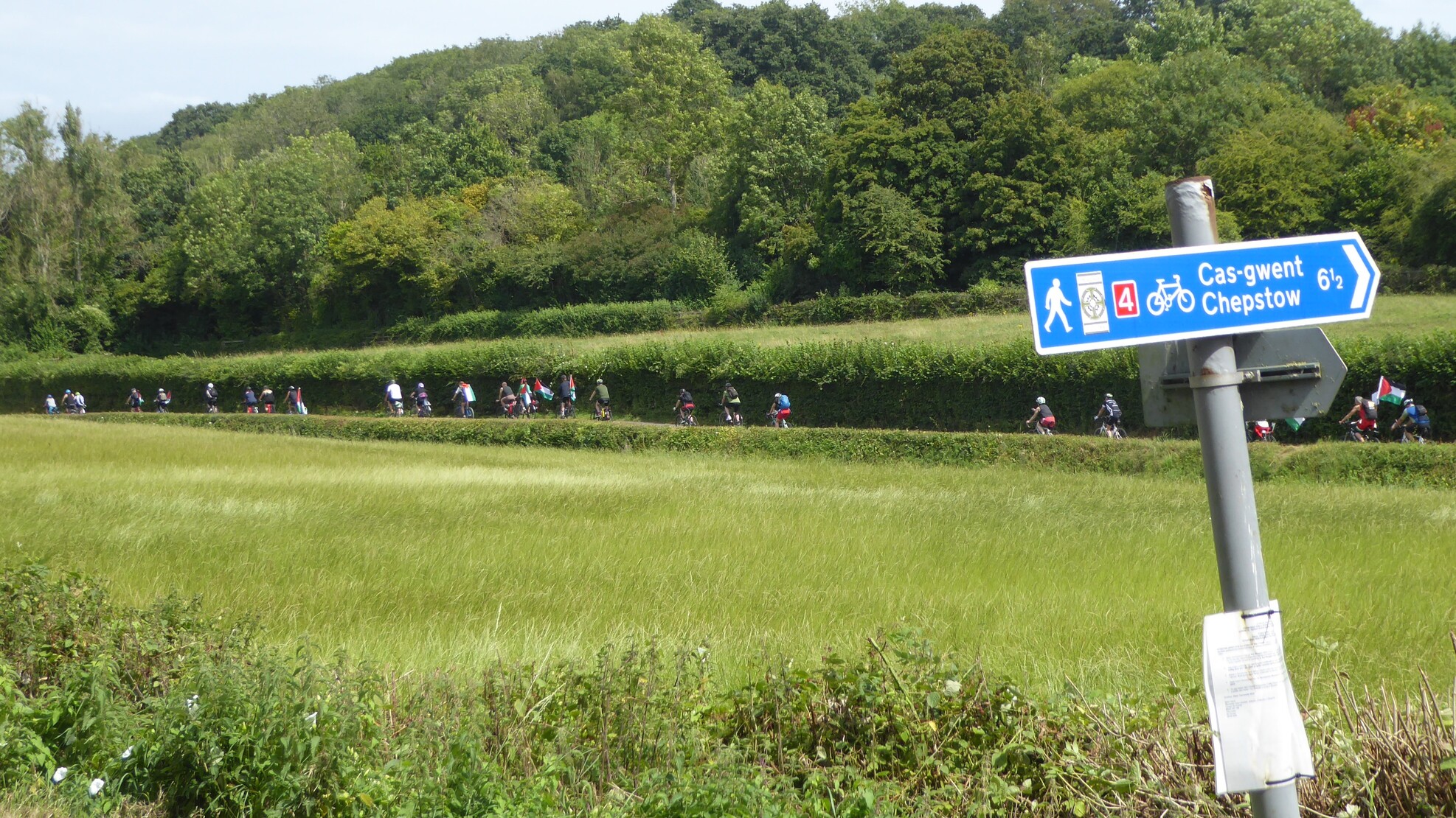Slight hills up to Chepstow, we skirted the town. We waited to regroup at the top of the main access road and got loads of waves and tooting of horns from the motorists which was encouraging. Then down and over the bridge, this time on the west side before turning south east through the peri-urban sprawl before tea break at Easter Compton hall. Shorter break to make up time. Belal still going strong at the front.